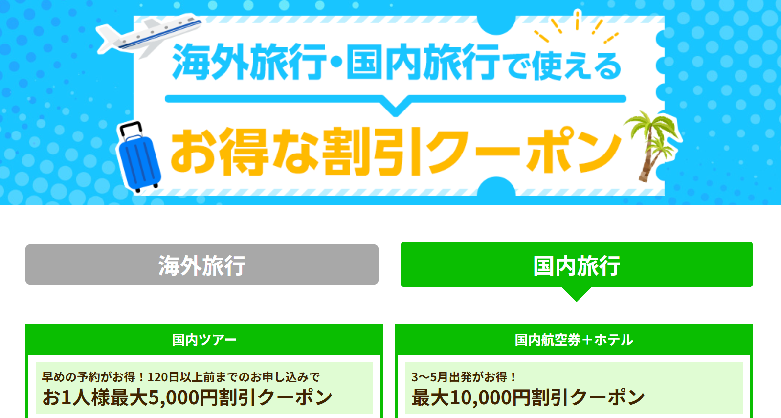 - クーポンごとに適用対象が異なります。(例:海外ツアー限定、国内ホテル限定など)
