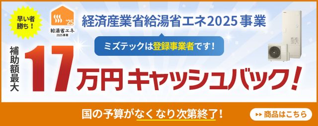 経済産業省が実施している、「給湯省エネ事業 2025」では、省エネ性能の高い、エコキュート・ハイブリッド給湯器・エネファーム設置の際、最大17万円まで補助を受け取ることが可能です。