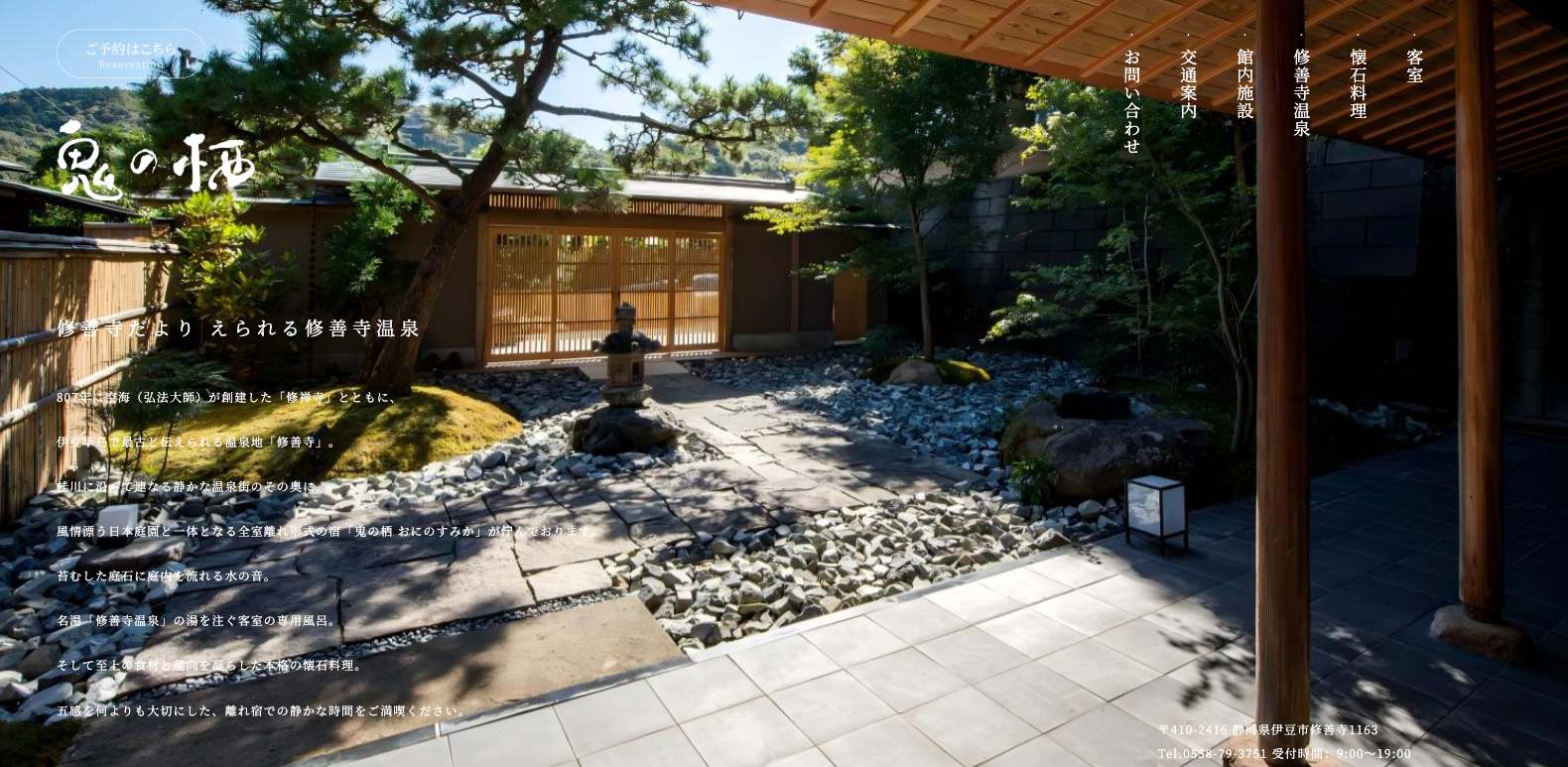 - 修善寺 離れ宿 鬼の栖: 静寂に包まれた全室離れの宿。美しい日本庭園を眺めながら、誰にも邪魔されることなく、ゆっくりと語り合う時間を満喫できます。